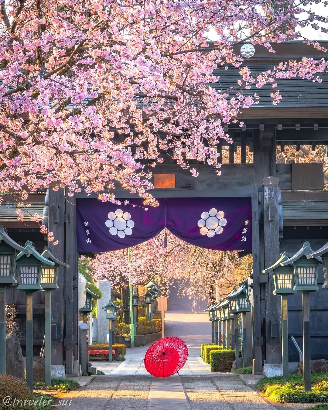 密蔵院(埼玉県)を写した美しい一枚。550年余りの歴史がなす風格、そして生き生きと咲いた安形桜。境内と桜が参拝者を見守ってくれています。