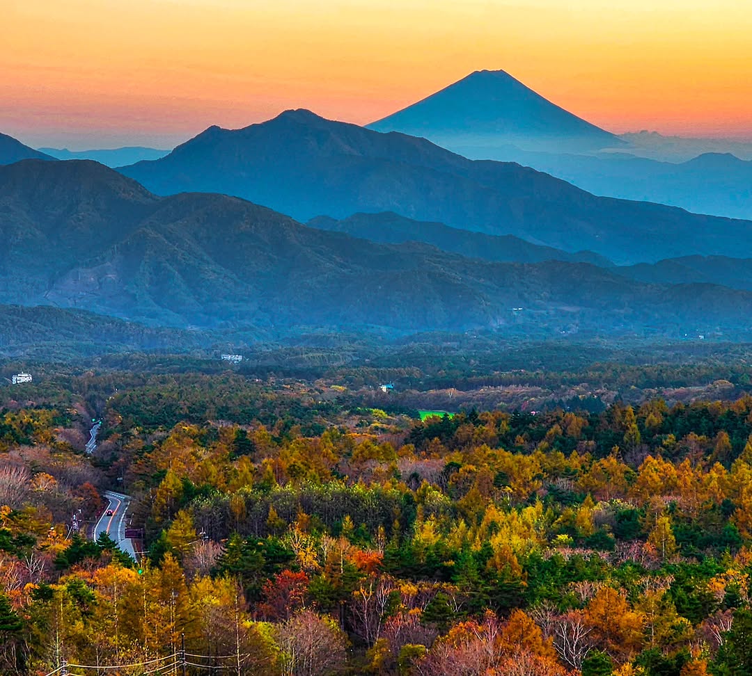 山梨県北杜市の美し森展望台で撮影された作品。夕方に染まる遠くの山と手前の紅葉の奥行きが素晴らしく、秋の空気を感じられるお写真でした。