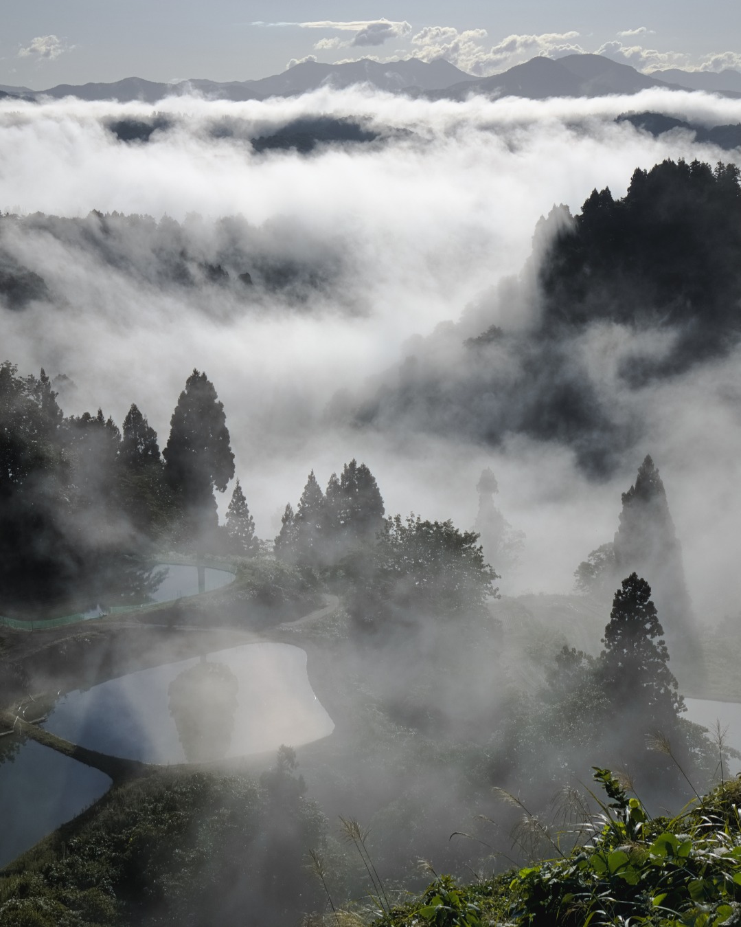 新潟県長岡市の山古志の棚田棚池。雲海が立ち込める山の様子がひときわ幻想的な作品でした。
