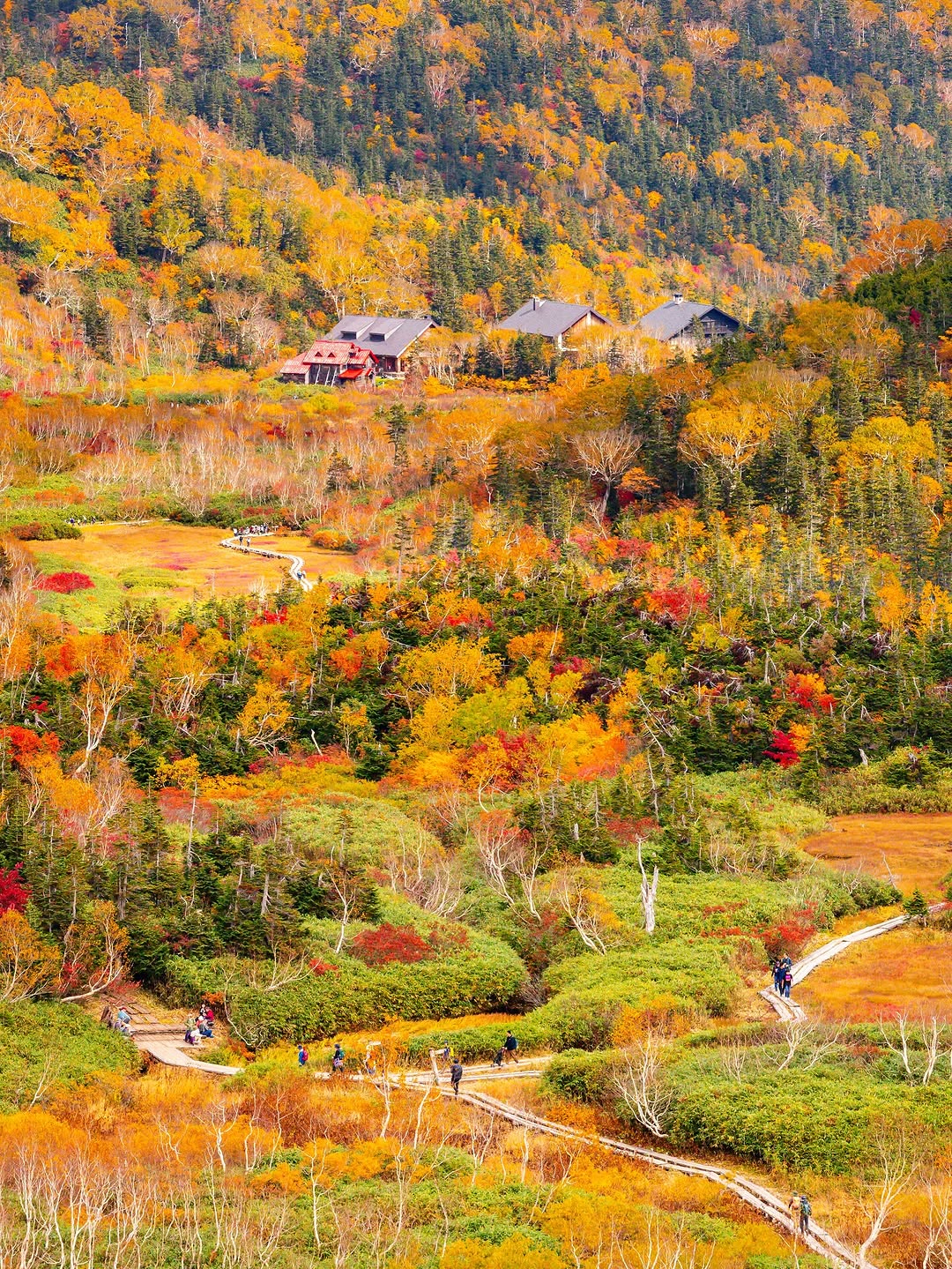 長野県にある栂池自然園で撮影された美しい紅葉のお写真。見渡す限りに広がる、黄や赤の色鮮やかな紅葉が見事な一枚でした。
