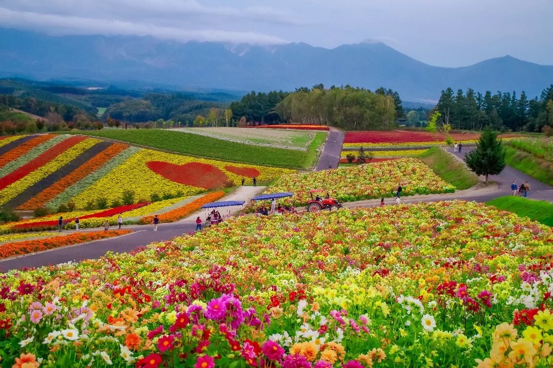 北海道の四季彩の丘で撮影されたお花畑。カラフルなお花と遠くの雄大な景色が北海道らしさを感じさせてくれます。