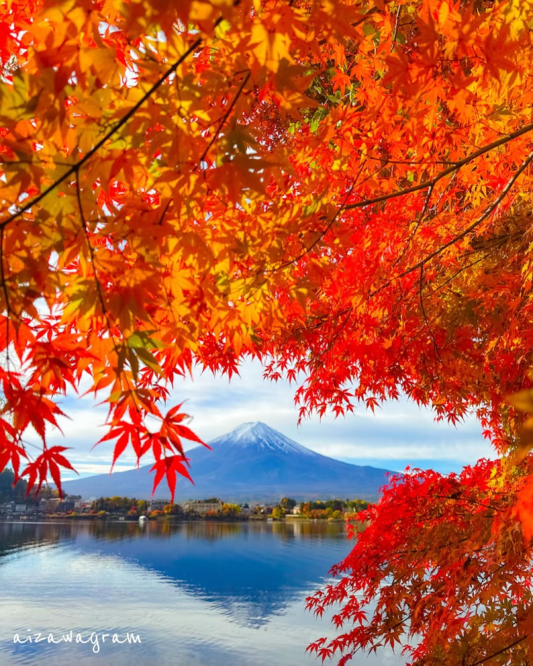 河口湖で撮影された紅葉と富士山のお写真。湖にも逆さ富士の反射がうつりこんでいて、見事に美しい作品でした。