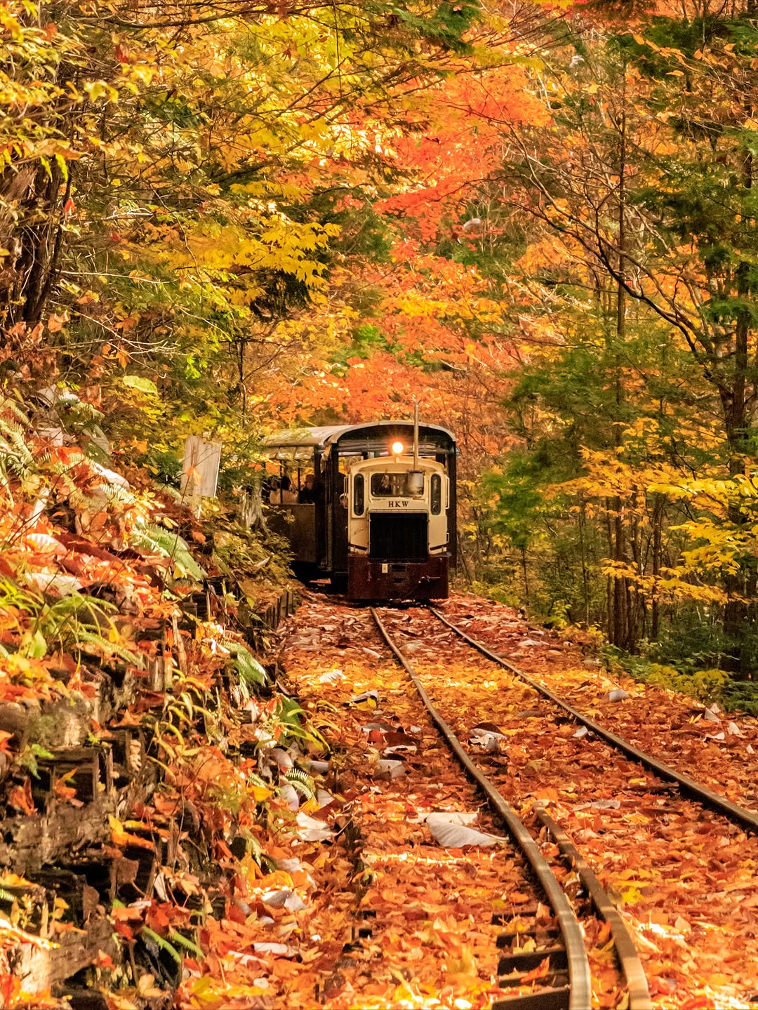 長野県赤沢森林鉄道で撮影されたお写真。秋らしく色づいた山の中を鉄道が走る様子が、素敵な物語の始まりを感じさせてくれます。