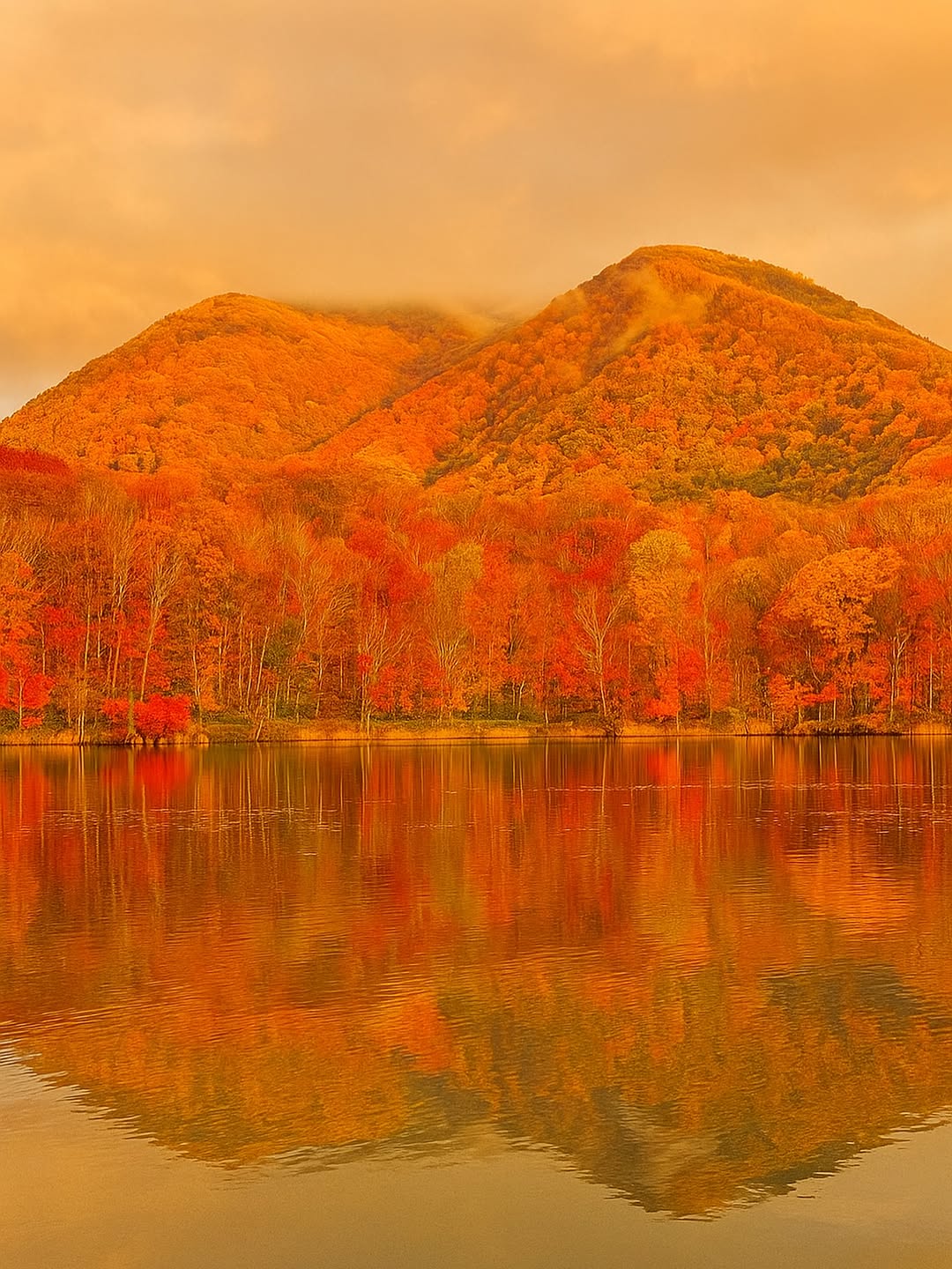 福島県観音沼森林公園の紅葉のお写真。秋らしい色合いの紅葉に染まる木々と湖が美しく、静かな静寂も感じさせます。