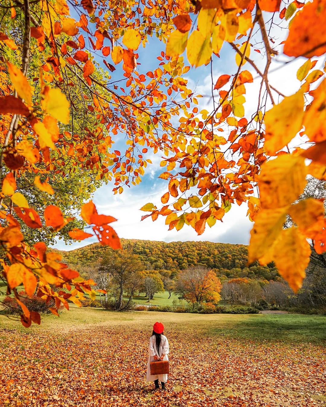 新潟県笹ヶ峰牧場で撮影された作品。秋色に色づいた葉と青空、後ろ姿で立つ女の子がかわいらしく、絵になる一枚でした。