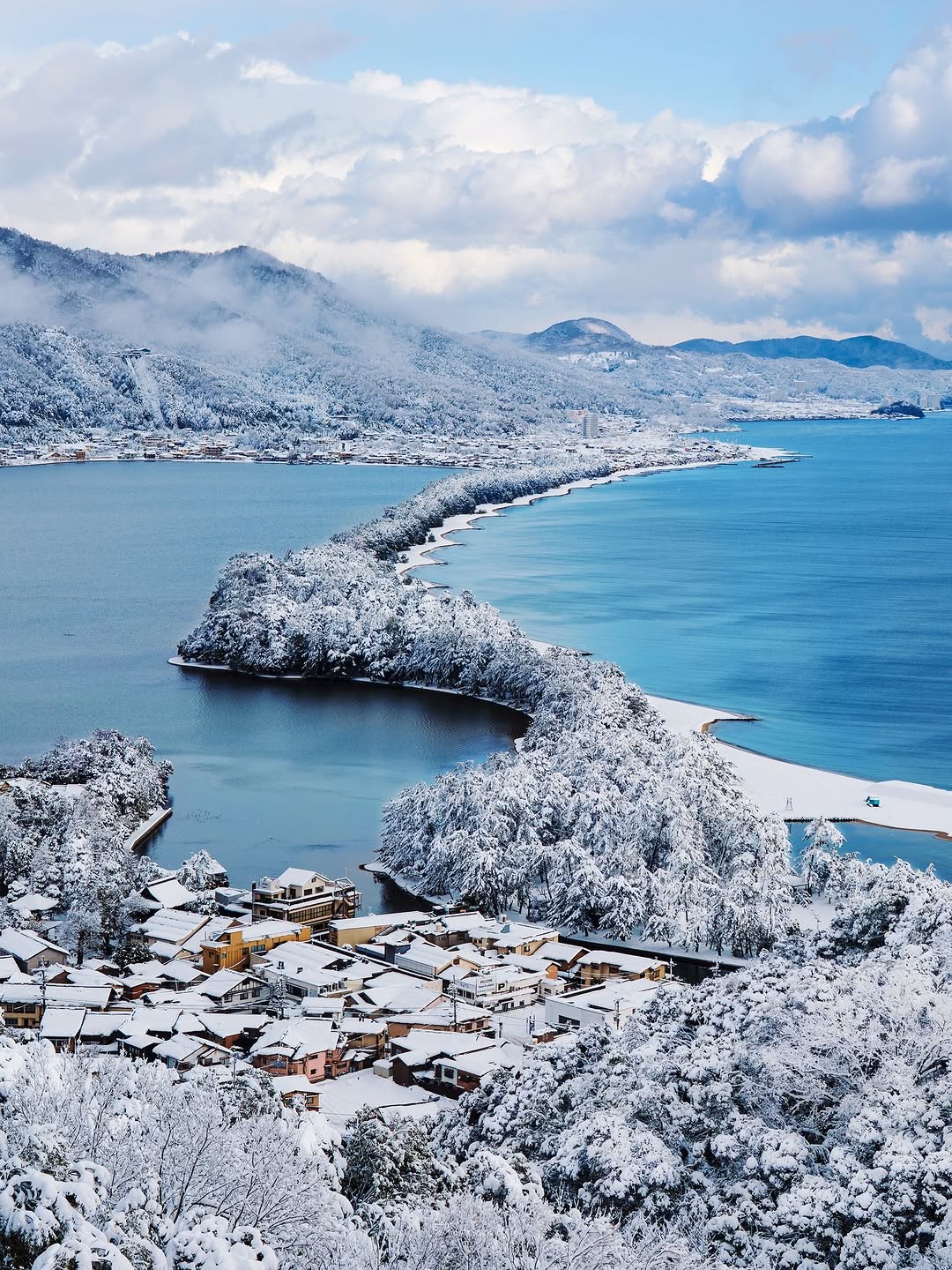 見事に雪が積もった天橋立を映したお写真。この時期しか見られない珍しい光景ですね!普段とは違う白い橋が海に架かった、とても美しい一枚に心が洗われます。