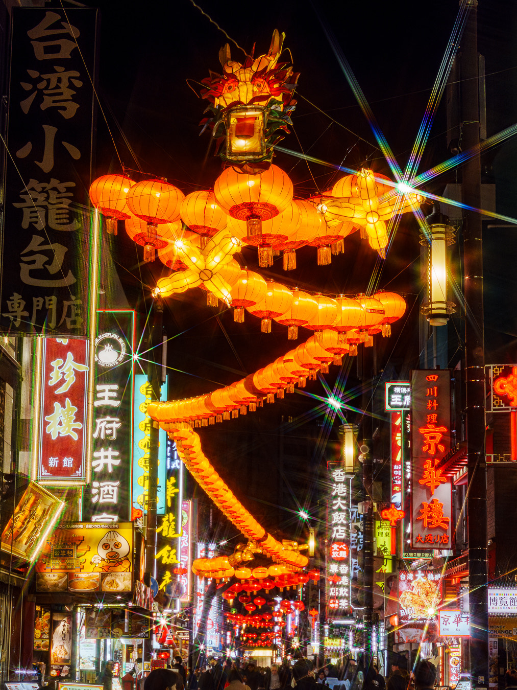 春節を迎えた横浜中華街での一コマ。ランタンで形作られた龍が今にも動き出しそうです!エキゾチックなネオン街に光の龍がうねる光景は、まるで異国のようです。
