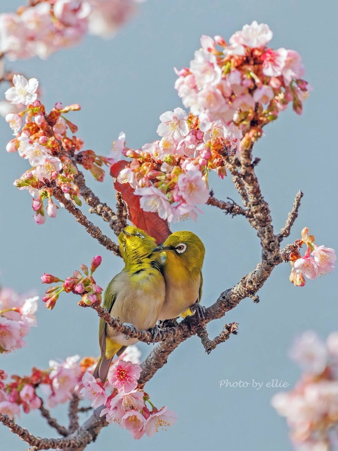 熱海の糸川遊歩道で、桜の陰で仲睦まじい様子のメジロのペアをパシャリ!投稿されたEllieさまの「メジロは生涯同じペア」というキャプションに、思わずキュンとしてしまいました。