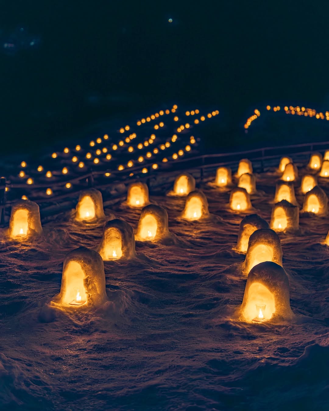湯西川温泉のかまくらまつりで撮影された、ミニかまくらのお写真。光のともされたかまくらたちがお行儀よく整列しているように見える、寒い中でも心がぽっと温まる光景です。