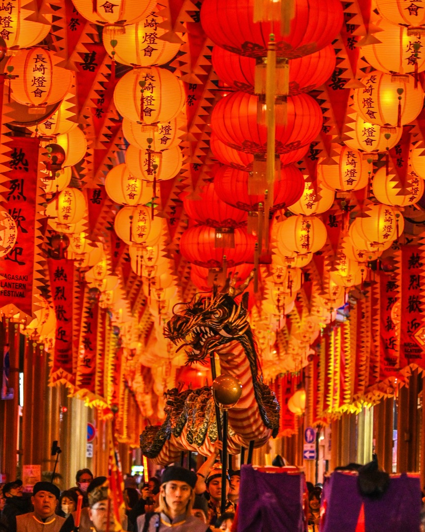 長崎ランタンフェスティバルで舞われる「龍踊り」。無数のランタンの中を進む龍の迫力を正面から切り取った一枚です。赤いランタンの光から、お祭りの活気が伝わってきます!