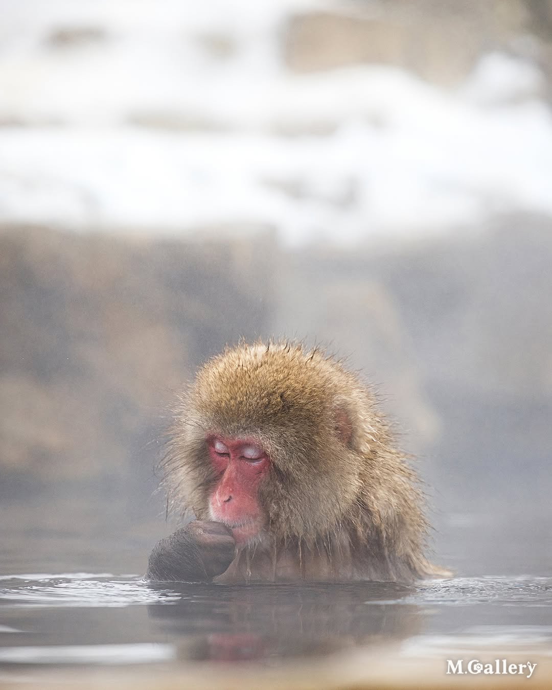 長野県地獄谷・野猿公苑のお風呂に浸かるお猿さんを映したワンショットです。リラックスしきったこの表情、まさに極楽!人間も動物も、温かいお風呂の魅力の前には同じ顔になってしまいますね。