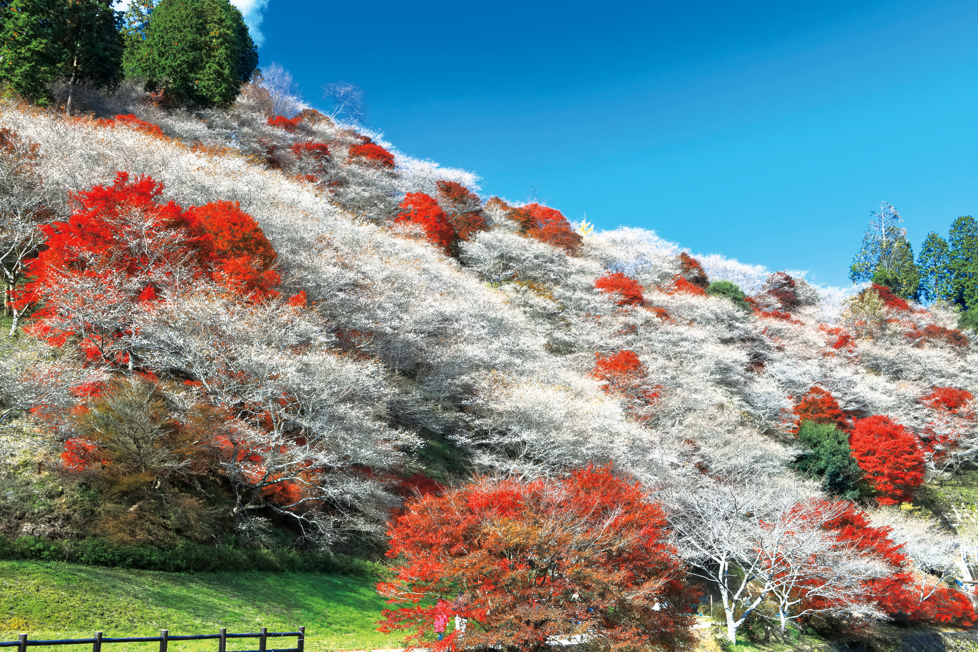 四季桜とは春と秋に花をつける桜。マメザクラとエドヒガンとの種間雑種と考えられており、夏に蓄えられた花芽が10月下旬から12月にかけて順に開花する。故に、この桜の咲く山では秋、桜と紅葉の競演という季節の花鳥風月を尊ぶ文化を有する日本人にはなんとも豪華な風景が見られるのだ。
