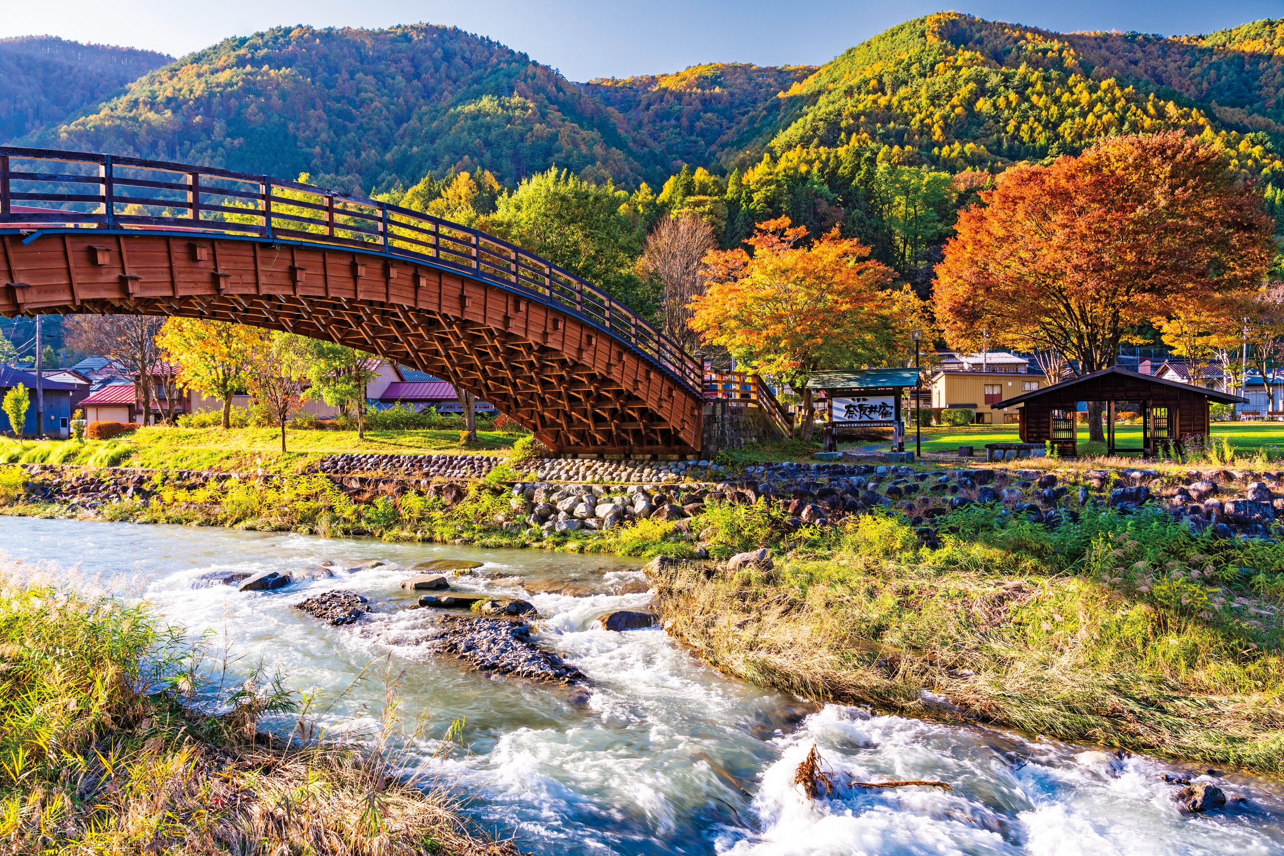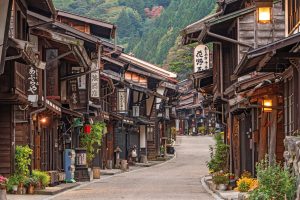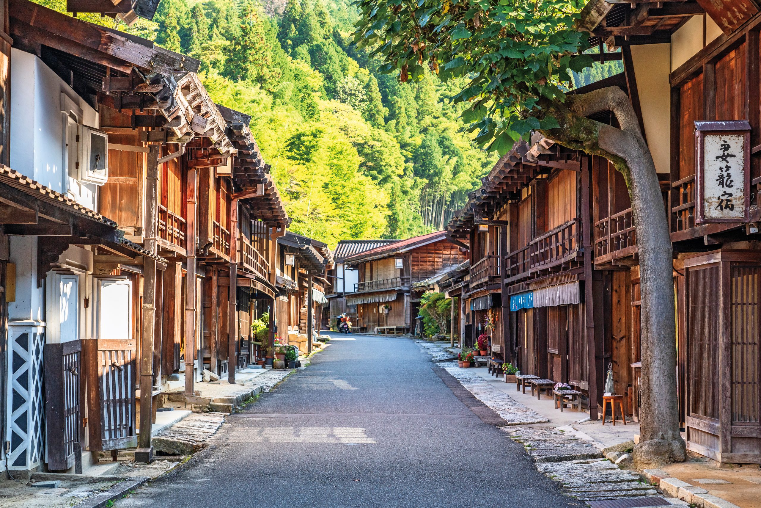 木曽路最大規模の宿場町で、江戸から来た旅人にとって中山道最大の難関と言われた鳥居峠前の最後の宿として大いに栄えた。奈良井千軒と言われた往時の街並みはいまも健在で、約1Kmに渡って続く街道沿いに出梁造りと呼ばれる木造の町屋が並ぶ様子は江戸期そのまま。1階より2階の屋根が大きく張り出す町屋の間には山からの清流が流れる水場もあり、大勢の旅人が行き交った山深い宿場の姿が容易に想像できる。