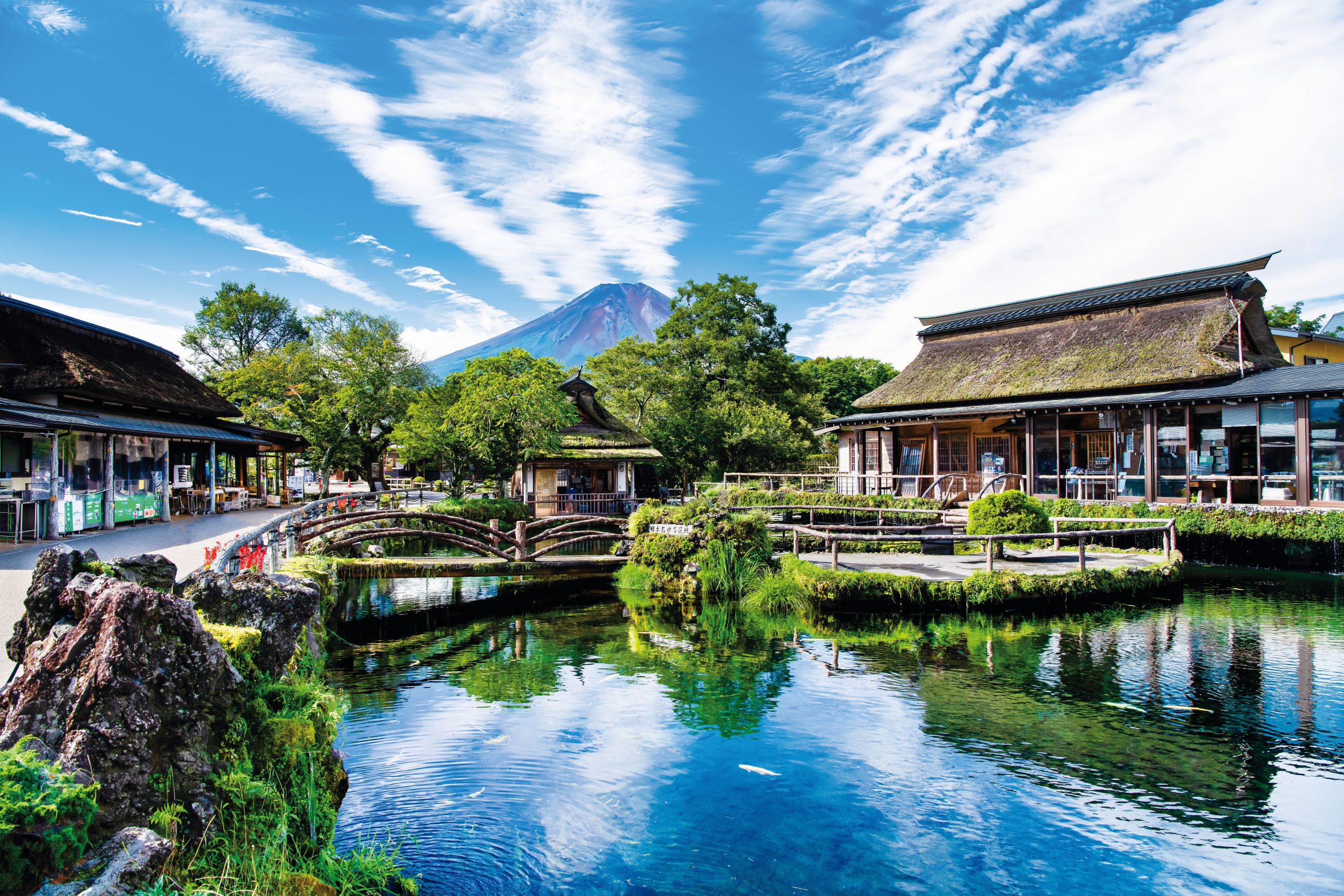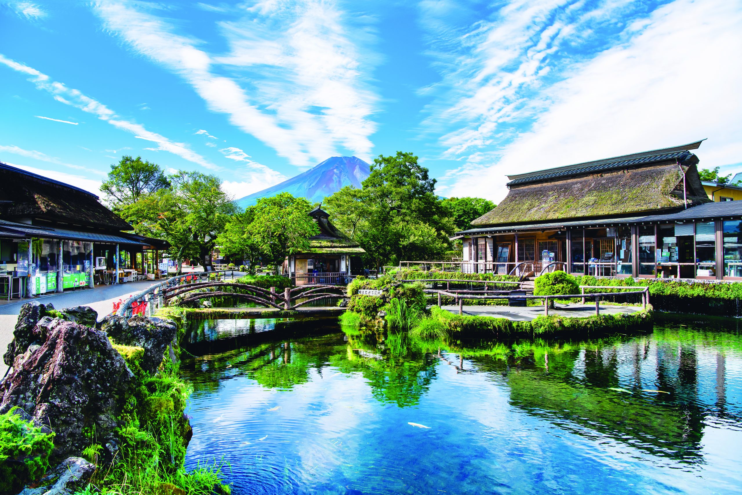 忍野には信じられないほど透明度の高い湧水群がある。出口池、お釜池、底抜池、銚子池、湧池、濁池、鏡池、菖蒲池からなる忍野八海だ。いずれも水源は霊峰、富士の伏流水。山に降った雨雪が数十年の時をかけて溶岩によって濾過され、清らかな水になって池に湧き出る。