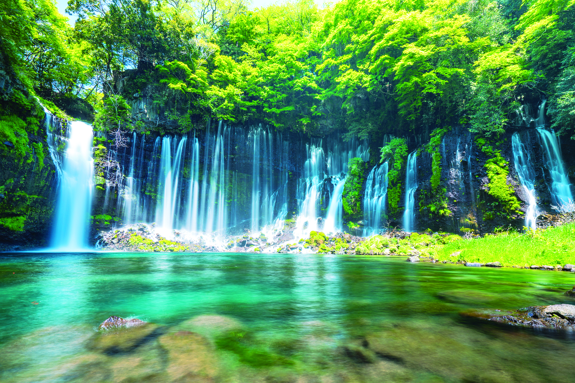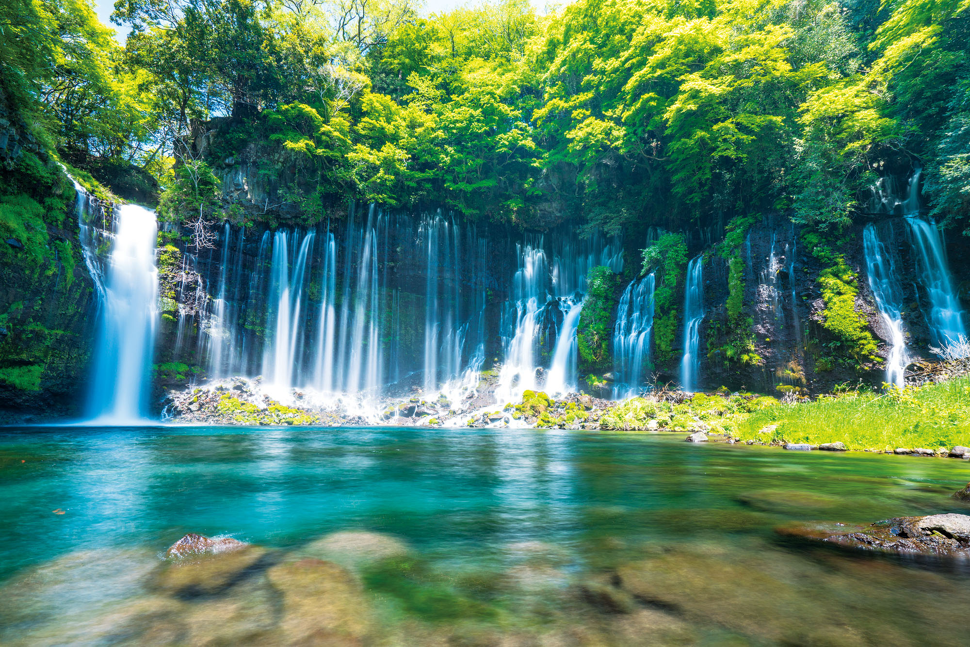 世界文化遺産「富士山ー信仰の対象と芸術の源泉」の構成資産でもある富士山周辺の水場をもうひとつ。静岡県富士宮市にある白糸ノ滝だ。その名の通り、高さ約20m、幅約150mに渡ってまるで生糸のような水の筋が続く名爆で、その水のほとんどが富士の湧水だという。水温は通年12℃ほど。毎秒1.5トンの水がつくり出すマイナスイオンが心身をリラックスさせ、清浄な空気も心地よい。