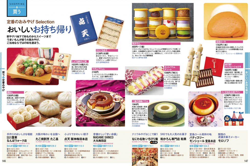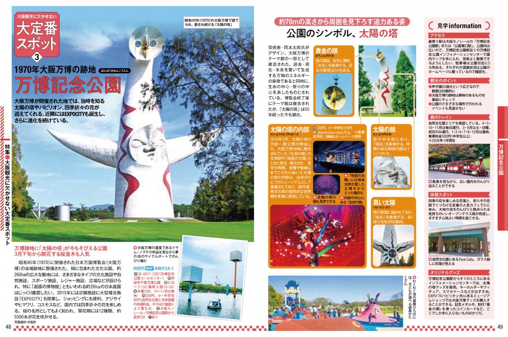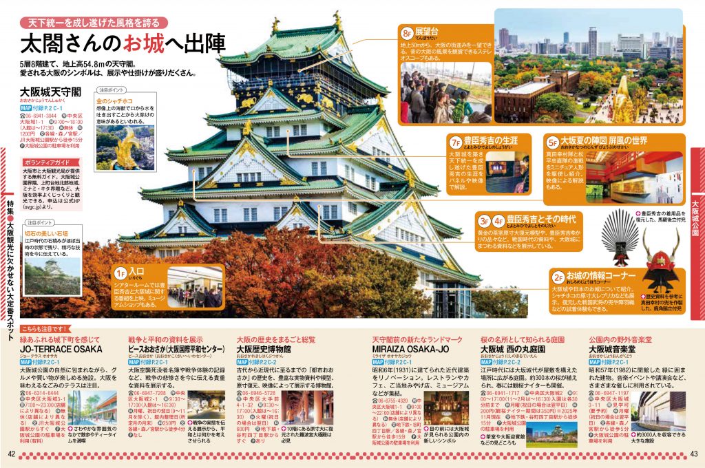巻頭では「進化する巨大ターミナル梅田」と題して、約160の店舗数を誇る複合商業施設LINKS UMEDA、地下街を大幅にリニューアルしたホワイティうめだ、JR大阪駅直結したエリアにオープンし、話題を呼んでいる大規模な都市公園・グラングリーン大阪、JPタワー、イノゲート大阪、うめきたグリーンプレイスが新たに加わった大阪ステーションシティ、グランフロント大阪を特集。続いては大阪城公園、海遊館、万博記念公園、ユニバーサル・スタジオ・ジャパンなど大阪観光の大定番スポットを紹介。